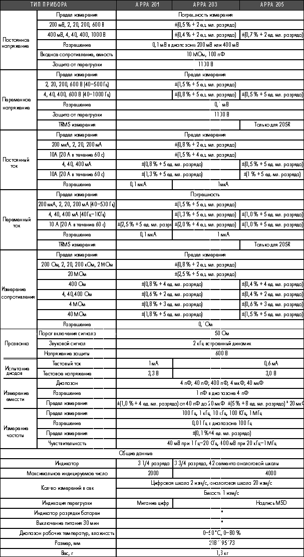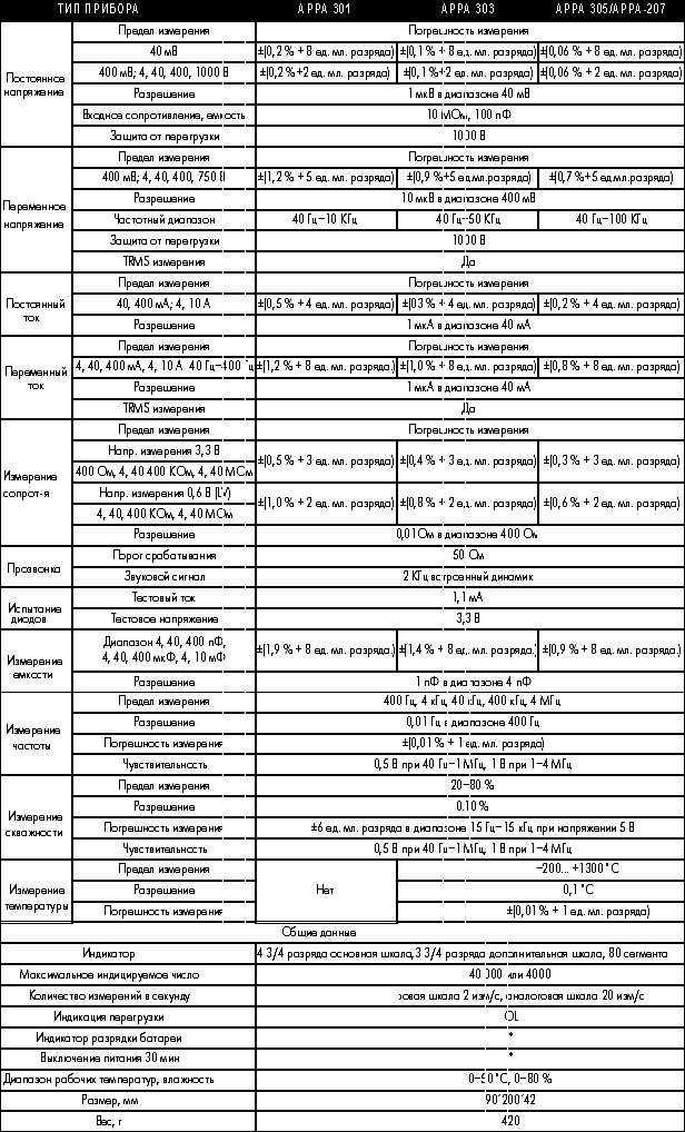 Отличия между моделями приведены в табл. 15. Технические данные приведены в табл. 16, а технические данные для мультиметра АРРА-207 приведены в табл. 18.