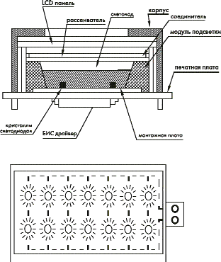 а) Прямая подсветка. Используется с многоцветными и/или точечно-матричными модулями жидкокристаллических дисплеев |