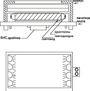 Боковая подсветка используется в модулях с количеством знакомест в строке до 20. При количестве знакомест свыше 20 в центре LCD образуется более темная, чем на краях, область. Для устранения этого недостатка применяют специальные меры, например дополнительную подсветку сверху.