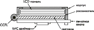 Для CCFL-подсветки характерны относительно малое потребление и очень яркий белый свет. Используются две технологии: прямая и боковая подсветки (рис 5, а, б).