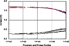 Рис.12. Зависимость напряжения на выходе элемента памяти от числа циклов программирования и стирания (для четырех элементов, один миллион циклов)