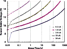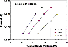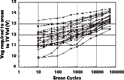 Для характеристики захвата электронов используются тестовые структуры матрицы с доступными поликремниевыми плавающими затворами. На рис. 13 показана зависимость напряжения туннельного перехода как функции времени, снятая на тестовой структуре. Смещение напряжения вызвано захватом электронов в слое оксида, обеспечивающем туннелирование электронов, и является функцией интегральной плотности потока. Смещение кривой I-V слоя оксида туннелирования в зависимости от интегральной плотности потока инжектированного заряда приведено на рис. 14. Зависимость напряжения, необходимого для стирания на выбранном вентиле, от числа циклов записи и стирания показана на рис. 15.
