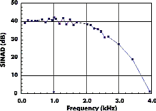 Рис.16. Зависимость параметра SINAD от частоты сигнала при Vcc = 2,7 В, Т = 20 °С, и размахе входного сигнала 32 мВ