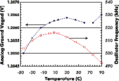 Рис.18. Зависимость аналогового опорного напряжения и частоты генератора от температуры (Vcc = 2,7 В)