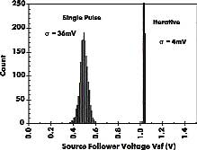 В тестовом режиме записанный сигнал может быть считан непосредственно из памяти (~Vsf). Эффект провала напряжения на конденсаторах УВХ незначителен при рабочих температурах. Однако он может наблюдаться на Vsf при записи Vagnd при температуре 125 °С (рис. 19). На рис. 20 представлено среднеквадратичное распределение Vsf (s= ~4 мВ) для программы итерации и для одиночного импульса.