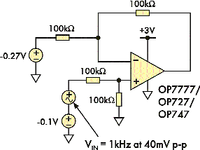 На рис. 1 представлена схема включения ОУ OP777, OP727 и OP747 для работы в качестве дифференциального усилителя с однополярным питанием +2,7 В. Входное напряжение не более 400 мВ подается на неинвертирующий вход. Режим микротокового потребления обеспечивается за счет включения резисторов с большим сопротивлением на входе и в цепь обратной связи (ОС).