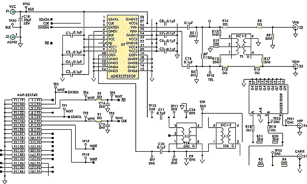 Для разработки приложений на основе AD8322 фирмой Analog Devices выпускается специальная плата — AD8322-EVAL (Evaluation Board), поставляемая с программным обеспечением CABDRIVE_22, работающим из-под ОС Windows. Принципиальная схема AD8322-EVAL приведена на рис. 10.