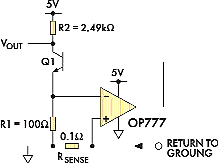 При разработке схем управления источников питания большое внимание уделяется надежности их длительной работы при изменяющихся в широких пределах токах нагрузки. На рис. 2 изображена схема токового мониторинга однополярного стабилизатора напряжения, поключенного к источнику 5 В, которая может быть успешно применена в стабилизаторах напряжения с обратной подачей ограничительного тока или в мощных источниках питания с автоматической защитой шунтированием. Роль датчика в схеме выполняет шунт RSENSE сопротивлением 0,1 Ом. На нем создается небольшое падение напряжения. Напряжение на инвертирующем входе становится равным напряжению на неинвертирующем входе за счет обратной связи через транзистор Q1 (2N2222 или аналогичный n–p–n-транзистор). Это приводит к тому, что падение напряжения на резисторе R1 эквивалентно падению напряжения на шунте RSENSE. Поэтому ток через транзистор Q1 прямо пропорционален току через RSENSE, а выходное напряжение будет равно: