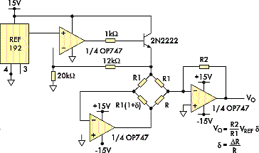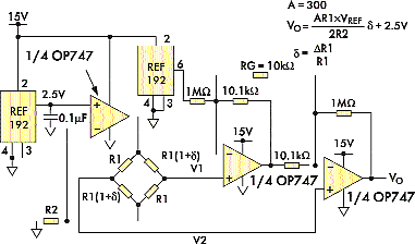ОУ OP777, OP727 и OP747 хорошо подходят для приложений, в основе которых лежит электрический мост. На рис. 3 изображена схема, используемая в однополярном источнике питания. Ее выходной сигнал линейно пропорционален дробному отклонению моста (d). Напомним, что