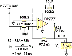 Падение напряжения на резисторе R2 увеличивается с увеличением тока IL, поэтому выходное напряжение уменьшается при увеличении выходного тока. Для элементов, указанных на схеме, величина выходного напряжения составляет 2,5 В при обратном токе 1 А.