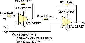 Схема однополярного инструментального усилителя на основе ОУ ОР727 изображена на рис. 6. В ней должно выполняться условие: R3/R4 = R1/R2. Коэффициент ослабления синфазного сигнала при постоянном токе составляет: