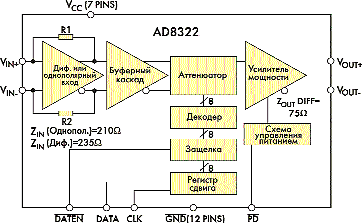AD8322 представляет собой недорогой усилитель с цифровой регулировкой коэффициента усиления, предназначенный для управления сигналами в коаксиальных кабельных линиях на основе модемов стандарта MCNS-DOCSIS. Коэффициент усиления регулируется с шагом 6,02 дБ на основной несущей и может достигать значений от –12,64 до 29,5 дБ. Он определяется значением 8-битного последовательного слова, подаваемого на вход управления. AD8322 имеет низкий коэффи- циент шума и работает на нагрузку сопротивлением 75 Ом (коаксиальный кабель). Структурная схема драйвера AD8322 представлена на рис. 7.