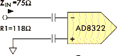 Дифференциальное входное сопротивление AD8322 составляет 235 Ом. При необходимости обеспечить входное сопротивление равным 75 Ом используется схема, изображенная на рис. 8. Можно добиться и других значений входного сопротивления, определяемых резистором R1: