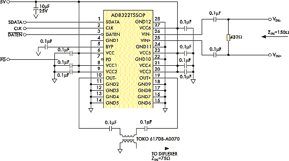 На рис. 9 приведена типовая схема включения AD8322. Следует обратить внимание на то, чтобы все выводы GND были соединены с общим (земляным) проводом. Выходной трансформатор должен иметь коэффициент трансформации 1:1. Вместо трансформатора типа 617DB-A0070 можно использовать MA/COM ETC-1-1T-15.