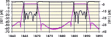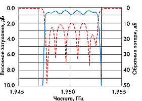 Центральная частота пропускания — 1,95 ГГц. Полоса пропускания фильтра — 5 МГц. Неравномерность АЧХ в полосе пропускания — не более 0,5 дБ, вносимые затухания — около 0,35 дБ.