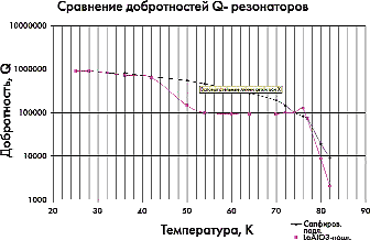 Предположение о достижимых рабочих характеристиках одиночного дискового резонатора и различных типов фильтров может быть сделано, основываясь на измеренной величине критического магнитного поля [4]. Один из фильтров, реализованных на частоте 2 ГГц, — однополюсный с добротностью нагруженного фильтра около 3000. При 60 К очень хорошие ВТСП-пленки позволяют получать величину критического поля около 150 А/см. Это соответствует критической циркулирующей мощности величиной 1125 Вт и 235 Вт для сапфировой и LaAlO3-подложек толщиной 0,5 мм соответственно на частоте 2 ГГц. На рис. 10 изображена температурная зависимость добротности (режим ТМ010) данного ненагруженного дискового резонатора от температуры при разном материале подложки. Очевидно, что использование сапфировой подложки является более предпочтительным, чем LaAlO3, поскольку tgd слабо меняется в широком температурном диапазоне [4]. Существует резко выраженное увеличение добротности резонатора на сапфировой подложке в технически привлекательном для реализации криокулера температурном диапазоне.