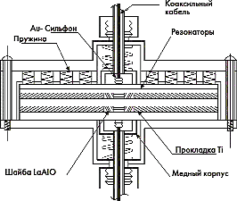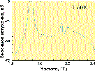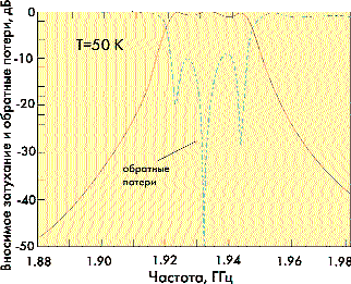Измеренная добротность ненагруженных резонаторов на 50 К составляла 100 000 и ограничивалась только диэлектрическими потерями в подложке. Расчетные вносимые затухания составили величину 0,02 дБ для Q = 100 000 при Т = 50 К. Суммарные потери на сопротивлении позолоченной гофрированной трубки — сильфоне составила 0,002 Ом. Таким образом, рассеиваемая мощность на сильфонах составила менее 40 мВт. Это согласуется с измеренной величиной вносимого затухания (менее 0,1 дБ) [6].