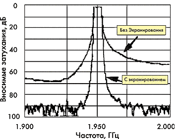 На рис. 2 приведены АЧХ фильтра при его экранировании и без него [5]. АЧХ фильтра была снята при охлаждении до 70 К. Соединительные провода были откалиброваны при комнатной температуре, поэтому снижение потерь в кабеле при комнатной температуре и при 70 К было скорректировано в ходе эксперимента. При экранировании спад АЧХ на границе полосы пропускания составляет 0,8 МГц/30 дБ, а без него — 0,7 МГц/30 дБ. Увеличение крутизны спада АЧХ при экранировании фильтра объясняется уменьшением паразитной связи между резонаторами.