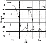 Высокая чувствительность к перестройке параметров является перспективной для построения управляемых ВТСП-фильтров ЖИГ. АЧХ фильтра сняты с помощью панорамного измерителя КСВН и представлены на рис. 4. Ограничение характеристик на уровне – 40 дБ является следствием несовершенства используемых КИП.