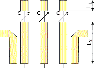 Тип перестраиваемого фильтра, настройка которого осуществляется путем изменения емкости конденсатора (варактора), был также разработан в Санкт-Петербурге. Трехполюсный фильтр с центральной частотой 2 ГГц обладает 1 %-й полосой пропускания и коэффициентом перекрытия диапазона, равным 2 [9]. На рис. 5 представлена структурная схема данного фильтра. При изменении емкости конденсатора от 1,2 до 0,6 пФ происходит сдвиг центральной частоты [9]. Перестраиваемый конденсатор подключался между двумя участками микрополосковых линий L1=2 мм и L2= 12,95 мм.