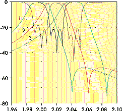 Поскольку передаточная характеристика фильтра относительно центральной частоты не уменьшается (с точностью 0,2 дБ) и составляет ±0,25 ГГц, то это позволяет использовать данный фильтр для работы в диапазоне перестройки 3G (1927,5…2157,5 МГц) систем связи [1, 7].