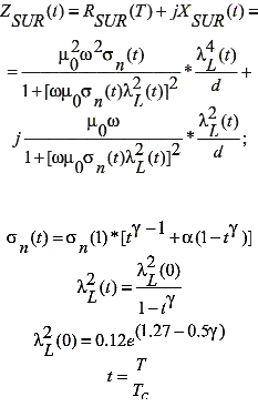 Широкие перспективы применения сверхпроводников в компонентах СВЧ-диапазона объясняются возможностью получения тонких пленок ВТСП-керамики на монокристаллических подложках. Как правило, к основным параметрам ВТСП-пленок относят удельное сопротивление и магнитную восприимчивость. При описании поведения пленок на высоких частотах используют такой параметр, как поверхностное сопротивление. Согласно феноменологической модели, для описания поверхностный импеданс ВТСП-керамики в сверхпроводящем состоянии имеет следующий вид [8]: