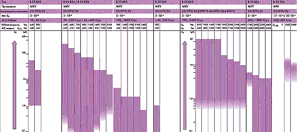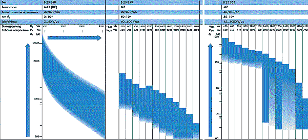 Наглядно весь спектр выпускаемых фирмой Epcos конденсаторов представлен на диаграммах 1 (конденсаторы для цепей постоянного тока) и 2 (конденсаторы для цепей переменного тока).
