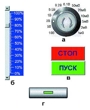 Примеры типовых органов управления, функционирующих в MS Excel, представлены на рис. 2. Эти рисунки, выполненные в растровом формате и вставленные в Excel. При нажатии мышью на правую стрелку переключателя пределов измерения (рис. 2, а) белая точка, указывающая предел измерения, перемещается на один шаг по часовой стрелке; при нажатии на левую кнопку точка движется в обратном направлении. В заранее заданной ячейке (например, A3) появляется число, указывающее номер позиции переключателя. Этот номер можно использовать, например, для масштабирования данных, принятых от системы их сбора.
