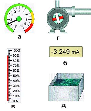 Элементы индикации строятся аналогично. Неподвижная часть создается в любом графическом редакторе или просто вводится сканированное изображение фотографии реального объекта. Подвижная часть может быть создана либо в растровом формате, либо в векторном — средствами самого Excel. Важно отметить, что набор функций для управления этими типами объектов различен. Например, растровый формат невозможно повернуть на заданный угол, а векторный формат невозможно масштабировать относительно первоначального размера. Поэтому стрелка выполнена в векторном формате (рис. 2, а), а красный столбик указателя — в растровом (рис. 3, в), что позволило масштабировать его относительно исходного размера.