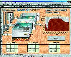 Система RealLab! позволяет также создавать несложные системы управления технологическими процессами. В качестве примера на рис. 6 показана программа автоматизации техпроцесса изготовления пенополистирольных изделий. ЖКИ-индикаторы отображают температуру термопар, вертикальные шкалы — уровень жидкости в баках, а график в динамике показывает ход технологического процесса. Температурный режим работы системы задается с помощью алгоритма, описанного на языке VBA.