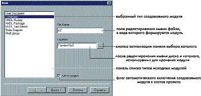 Сначала следует установить тип создаваемого исходного модуля. Для этого в предложенном списке диалоговой панели (см. рис. 10) с помощью мыши выделяют соответствующую строку. Содержание списка возможных типов исходных модулей зависит от инструментов синтеза, используемых в проекте. Далее активизируют поле редактирования названия модуля (файла) File Name. Ввод имени файла осуществляется с клавиатуры. Его расширение устанавливается автоматически в соответствии с выбранным типом модуля. Место расположения создаваемого модуля на диске указывается в поле редактирования Location диалоговой панели (рис. 10). По умолчанию предлагается рабочий каталог текущего проекта. Для изменения предложенного каталога можно использовать способы, описанные выше. После закрытия панели навигации выбранные параметры автоматически отображаются в поле редактирования Location. Особое внимание необходимо обратить на состояние индикатора автоматического включения модуля в состав проекта Add to project. Если флаг индикатора установлен (поле индикатора помечено маркером), то созданный модуль автоматически включается в состав текущего проекта. По умолчанию флаг индикатора находится в установленном состоянии. Для модификации этого параметра достаточно поместить курсор на поле индикатора и щелкнуть левой кнопкой мыши. Состояние индикатора изменится на противоположное.