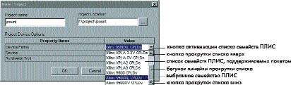 Аналогичными методами можно также изменить основные параметры проекта (семейство ПЛИС, тип кристалла и средства синтеза), выделив строку описания проекта в окне исходных модулей. Наиболее рационально дважды щелкнуть левой кнопкой мыши на строке описания проекта, в результате чего на экран будет выведена диалоговая панель с таблицей параметров (см. рис. 3). Выбор новых значений параметров осуществляется теми же способами, что и в панели создания нового проекта (см. рис. 4 – 6).