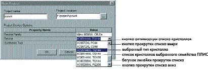 В поле выбора типа кристалла для реализации проектируемого устройства автоматически отображается тип ПЛИС, установленный по умолчанию для выбранного семейства. Для его изменения необходимо выполнить последовательность действий, аналогичную процедуре установки семейства ПЛИС. Вначале активизируют поле выбора типа кристалла Device, установив на него курсор мыши и щелкнув левой кнопкой. Затем нажимают кнопку вывода списка доступных кристаллов выбранного семейства (рис. 5).