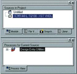 Окно процессов представляет собой эффективный визуальный механизм управления всем ходом проектирования устройства. В нем отображается поэтапная последовательность действий (операций), которые должны быть выполнены по отношению к модулю, выделенному в окне исходных модулей проекта. Таким образом, в окне процессов разработчику предоставляется подробный интерактивный план работы с проектом. Содержание окна процедур зависит от типа выделенного исходного модуля и семейства ПЛИС, выбранного для реализации проекта.