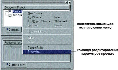 Главное меню управляющей оболочки пакета обеспечивает доступ ко всем командам, необходимым для работы с проектом. Каждый его пункт открывает всплывающее меню, в котором находится соответствующая группа команд. Всплывающее меню File содержит команды создания, открытия, сохранения и закрытия проектов и файлов, печати и завершения работы. Меню Edit объединяет команды работы со встроенным редактором HDL-кода и изменения параметров конфигурации Навигатора проекта. В меню View сгруппированы команды, определяющие вид окна Навигатора проекта. Его строки указывают, какие элементы окна будут выведены на экран, а какие — скрыты. Наличие маркера в строке меню View указывает на то, что соответствующий элемент пользовательского интерфейса представлен в основном окне Навигатора проекта. Для изменения состояния какого-либо элемента окна на противоположное достаточно щелкнуть левой кнопкой мыши на строке всплывающего меню, в которой указано название этого элемента. Меню Project содержит команды работы с проектом, которые позволяют включать в него модули исходных описаний, архивировать его файлы, использовать механизм «моментальных снимков», устанавливать параметры проекта по образцу (аналогичные параметрам другого проекта), удалять полученные результаты проектирования. В меню Source находятся команды, предназначенные для выполнения операций с модулями исходных описаний,которые позволяют открывать, закрывать, переименовывать, удалять и помещать в библиотеку исходные модули проекта и устанавливать его параметры. Меню Process предоставляет команды управления процессами разработки — команды активизации процедур, просмотра отчетов об их выполнении и установки параметров процессов. Команды меню Macro используются при работе с макросами во встроенном текстовом редакторе HDL-кода для формирования, сохранения, загрузки и выполнения макрокоманд при редактировании текста HDL-описания. Меню Window содержит команды работы с окнами текстового редактора HDL-кода, используемые для создания необходимого количества рабочих окон и установки их конфигурации. Пункт Help основного меню обеспечивает доступ к справочной информации и ресурсам Web-сайта xilinx.com, если используемый компьютер имеет выход в Internet. Однако не все команды доступны в тот или иной момент работы c программой. Заблокированные команды обозначаются серым цветом. Навигатор проекта автоматически определяет область доступности каждой команды, что позволяет исключить ее неправильное использование. Такой механизм, например, позволяет избежать выполнения недопустимых операций над исходными модулями различных типов.