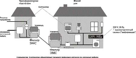 Домашний Интернет: передача данных внутри дома и между домом и силовой подстанцией (рис. 6). Подавление помех при использовании силовых кабелей в качестве проводников связных коммуникаций. В отсутствии фильтра ЭМП, радиоэлектронное оборудование абонента зашумлено наводками от сетевого  напряжения.