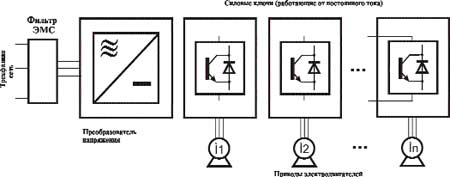 IGBT-транзисторы, активизируемые простым постоянным напряжением с выхода преобразователя, обеспечивают быстрое подключение или отключение приводов двигателей значительной мощности. На входе преобразователя — сетевое трехфазное синусоидальное напряжение, а на выходе — постоянное напряжение. Однако быстрая коммутация силовой цепи является источником высокочастотных помех. В результате проникновения помехи на вход, напряжение между фазами сети искажается (возникает помеха симметричного типа). Уровень асимметричной помехи также может быть значительным из-за  протяженного кабеля от преобразователя напряжения до внешней сети. Фильтр8 ЭМП Epcos, установленный на входе преобразователя, компенсирует практически без остатка обе помехи, «развязывая» преобразователь и внешнюю сеть.
