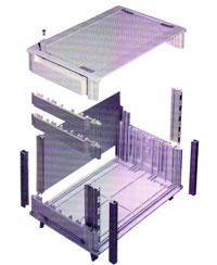 Поперечные профили также изменили свою форму и приобрели прямоугольные крепежные отверстия. Теперь направляющие печатных плат легко вставляются в эти отверстия и закрепляются на защелках. В прямоугольных отверстиях направляющих могут устанавливаться дополнительные несущие элементы, разделительные или экранирующие пластины. Кроме того, появилась возможность использования поперечных профилей, предназначенных для закрепления модулей, отвечающих требованиям стандартов IEEE1101.10 и IEEE1101.11.