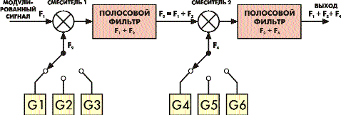 например, для радиостанций с небольшим количеством каналов. Но для перекрытия широкого диапазона частот потребуется большое количество опорных генераторов, что является весьма дорогостоящим решением. Используя делители частоты, имеющие структуру смеситель/фильтр/делитель, можно уменьшить количество необходимых опорных генераторов, хотя и в этом случае возможности перестройки останутся более чем скромными.