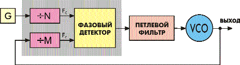 Этот метод синтеза использует принцип сравнения частоты и фазы выходного сигнала, формируемого генератором, управляемым напряжением (VCO), с сигналом опорного генератора. Структурная схема такого синтезатора показана на рис. 2. Обнаружение ошибки обеспечивает фазовый детектор (ФД), который работает на определенной частоте FC, называемой частотой сравнения. Эта частота получается путем деления частоты опорного генератора G на N. Частота выходного сигнала вначале делится на M, а затем сравнивается с частотой FC. При отклонении частоты на выходе ФД появляется управляющее напряжение, воздействующее на управляющий элемент VCO до исчезновения отклонения. Поскольку делители частоты имеют целочисленные коэффициенты деления, шаг сетки такого синтезатора определяет частота сравнения. Выходная частота определяется по формуле: