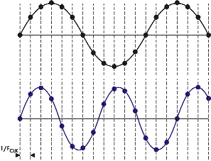 Выходной синусоидальный сигнал восстанавливается из отдельных отсчетов. Целое число отсчетов на период укладывается лишь в частном случае (рис. 6, а). В большинстве случаев это не так, и на каждом новом периоде сигнала отсчеты находятся в новых местах (рис. 6, б). Конечно, картина периодически повторяется, но период повторения может быть самым разным. Он зависит от кода частоты, разрядности аккумулятора фазы и от разрядности используемого кода фазы. В любом случае с равным успехом из последовательности отсчетов будет восстановлен сигнал синусоидальной формы.