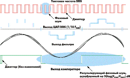 Относительное отклонение частоты на выходе DDS равно относительному отклонению частоты тактового сигнала. Относительный джиттер при делении частоты становится меньше, хотя его абсолютное значение не улучшается.