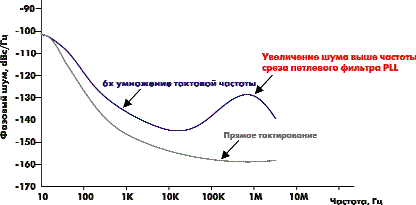 Некоторые типы DDS, которые способны работать на высоких тактовых частотах, имеют встроенный умножитель частоты на основе PLL. Для высокоскоростных DDS он позволяет использовать менее высокочастотный опорный генератор или вовсе обойтись уже имеющимися в системе тактовыми частотами. Примерами таких DDS могут служить AD9852 и AD9854, где тактовая частота может быть умножена на 4…20, а AD9851 имеет умножитель на 6. Однако использование умножения тактовой частоты не всегда желательно, так как при этом фазовый шум тактового сигнала увеличивается во столько же раз, во сколько раз умножается частота. Более того, выше частоты среза петлевого фильтра PLL может наблюдаться пик фазовых шумов (рис. 8). Несмотря на ухудшение характеристик, встроенный умножитель частоты удешевляет систему и может быть использован в большинстве случаев. Для особо критичных к чистоте спектра выходного сигнала приложений требуется непосредственное тактирование DDS от высококачественного опорного генератора.