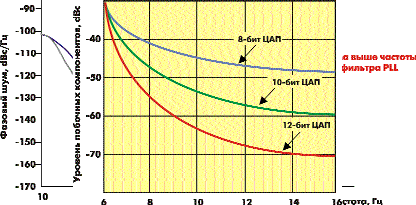 На рис. 9 приведены зависимости уровня побочных компонентов от разрядности кода фазы для ЦАП разной разрядности. Неограниченно наращивать разрядность кода фазы нет необходимости еще и потому, что снижение уровня побочных компонентов происходит только до определенного значения, зависящего от уровня шумов квантования ЦАП. На практике разрядность кода фазы должна быть на 2–3 разряда больше, чем разрядность примененного ЦАП.