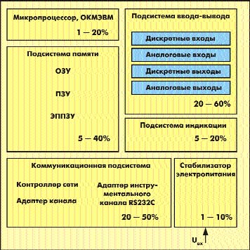Современные контроллеры используют разнообразную элементную базу, построены по различным архитектурным принципам и характеризуются широким диапазоном вычислительной мощности. В связи с этим сложно предложить унифицированную структуру контроллера с типовым набором подсистем. Кроме того, соотношение потребляемой мощности блоков может сильно отличаться в зависимости от типа контроллера. Например, доля энергопотребления подсистемы процессор-память в модуле универсального вычислителя может достигать 90 %, в то время как в типовом контроллере дискретного вывода на однокристальную микроЭВМ (ОКМЭВМ) приходится всего 10 — 30 % потребления.