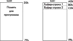 В настоящей статье использован следующий метод работы с памятью. В области памяти МК, в банке 1, отводится буфер, который содержит точную копию данных ОЗУ контроллера ЖКИ. Методы изменяют информацию в буфере, а по окончании выполнения преобразований, перезаписывают ОЗУ контроллера ЖКИ, когда он свободен. Может возникнуть вопрос: зачем так нерационально расходовать память. Расход памяти составляет 2ґ16 байт (размер поля ЖКИ). Автор исходил из того, что время выполнения методов (например, при смещении данных) значительно меньше, чем при работе непосредственно с памятью ОЗУ контроллера ЖКИ. Всю работу по преобразованию данных МК берет на себя, не затрагивая контроллер ЖКИ. За ним остается только задача вовремя выводить требуемую информацию.