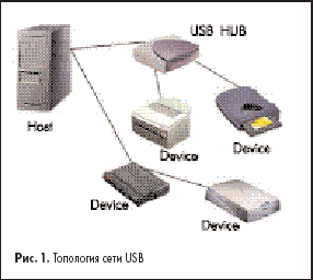 Как легко заметить, сеть USB построена по схеме многоуровневой «звезды». В сети есть одно управляющее устройство (HOST-контроллер), конечные устройства (DEVICE), а также концентраторы (HUB). Задача HOST-контроллера состоит в управлении сетью. Он заведует подключением и регистрацией устройств в сети, а также контролирует потоки данных. Только HOST-контроллер может обращаться к устройствам и управлять ими. Взаимодействие двух устройств в сети между собой напрямую невозможно.