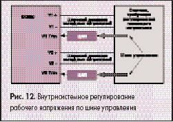 На рис. 11 показан пример использования EXB50, когда один из его выходов конфигурируется так, что значения выходных напряжений могут задаваться цифровым способом посредством установки перемычек. Это создает возможности, аналогичные возможностям модуля с микропроцессорным регулированием напряжения, благодаря цифро-аналоговому преобразователю, который трансформирует позиционный код перемычек в постоянное напряжение подстройки выходного канала конвертора. Эта идея может быть развита до построения систем с внутрисистемным регулированием рабочего напряжения по шине управления, как это показано на рис. 12. Такое решение может быть использовано для уменьшения рабочих напряжений, а следовательно, энергопотребления, в случае когда система находится в режиме неполной нагрузки. Определение предельно допустимых значений рабочих напряжений аппаратуры является штатным методом проверки устойчивости системы во время заключительных и корректности ее работы. Применение в системе конверторов типа EXB50 позволяет реализовать такие проверки в качестве встроенных функций системы. Требуются только один внешний резистор и соответствующая ячейка перемычки для проверки каждого значения в диапазоне работоспособности.