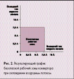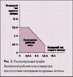 Конвертор EXB50-48D05-3V3 имеет номинальное значение выходной мощности 50 Вт, но значения токов нагрузки по каждой независимой выходной цепи определяют фактические ограничения по выходу. Каждый канал имеет максимальное значение тока нагрузки 7,5 А. При охлаждении воздушным потоком сумма выходных токов преобразователя составляет 15 А (результирующий график безопасной рабочей зоны показан на рис. 2). Если воздушный поток отсутствует, то суммарное значение выходного тока равно 10 А (результирующий график безопасной рабочей зоны показан на рис. 3). Некоторые допустимые сочетания выходных напряжений и токов нагрузки показаны в таблице 1.