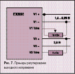 На рис. 9 показан пример применения постоянных резисторов для регулирования напряжения в обоих выходных каналах. Резистор 4 кОм устанавливает выходное напряжение 4,5 В в канале с номиналом 5 В, а резистор 1,15 кОм — 3,8 В в канале с номинальным значением выходного напряжения 3,3 В. Эти значения сопротивлений резисторов получены из графиков, приведенных на рис. 5 и 6 соответственно. В другом примере, показанном на рис. 10, для установки требуемых значений выходных напряжений используется напряжение разных уровней, прикладываемое к выводам Trim. В этом случае выходное напряжение канала с номиналом 5 В устанавливается в значение 3,8 В, а канала с номиналом 3,3 В — в значение 1,5 В путем подачи уровней напряжения, определенных по графикам, приведенным на рис. 8.